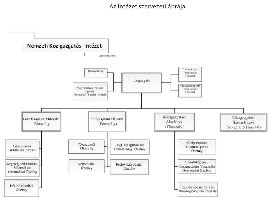 9. § (1) Az Intézet vezetését és önálló képviseletét a főigazgató látja el. A főigazgatót határozatlan időre – a Közigazgatási és Igazságügyi Minisztérium közigazgatási államtitkárának a javaslatára – a miniszter nevezi ki és menti fel és ő gyakorolja felette az egyéb munkáltató jogokat is.