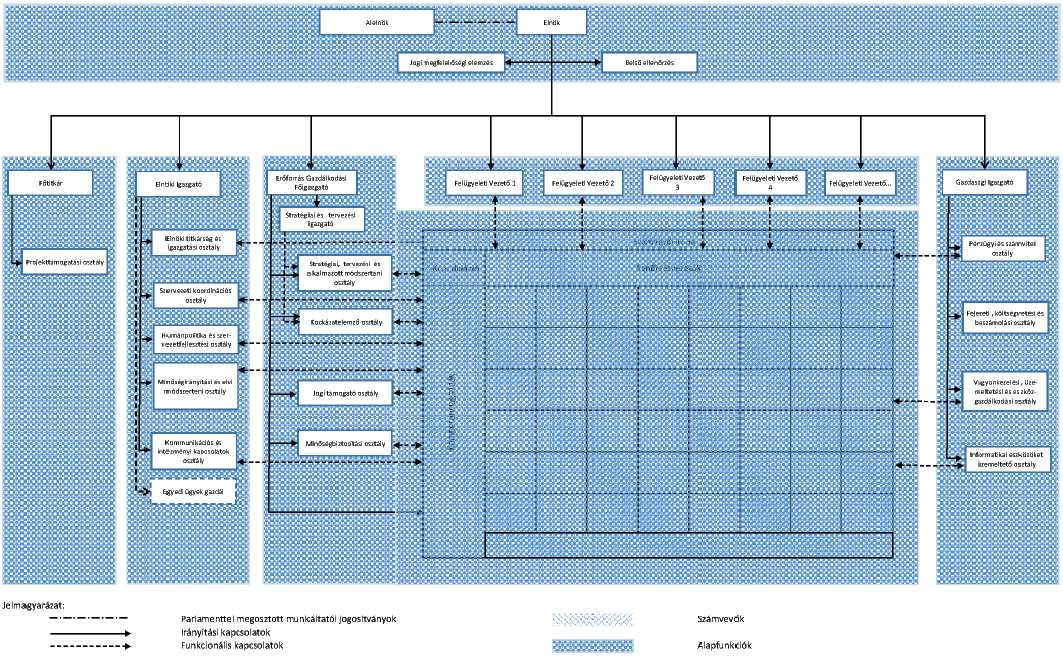 (4)13 Az Állami Számvevőszék egységes hivatali szervezetében vezetési törzskari, felügyeleti, közvetlen ellenőrzést végző, támogatási, valamint alap kiszolgáló funkciók szerint, a jelen szabályzat 2. mellékletében jelölt szervezeti struktúrában, az ott megnevezett munkakörök szerint irányított belső egységek működnek.