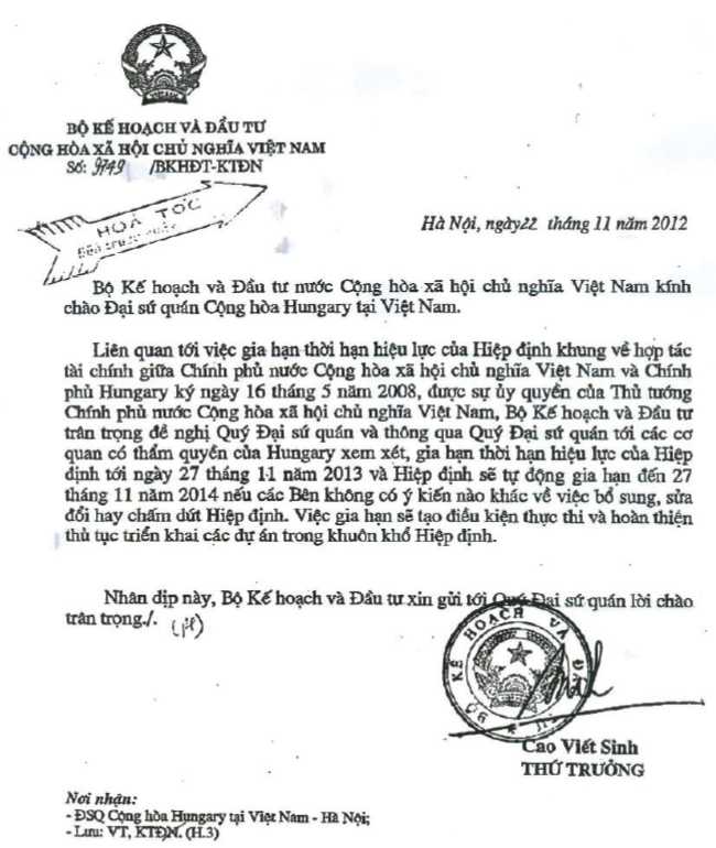 A Vietnámi Szocialista Köztársaság kormánya és Magyarország kormánya közötti Pénzügyi Együttműködésről szóló, 2008. 05. 16-án aláírt keretmegállapodás hatályának meghosszabbításával kapcsolatban a Vietnámi Szocialista Köztársaság kormánya miniszterelnökének megbízásából, a Tervezési és Beruházási Minisztérium tisztelettel kéri a Nagykövetséget, hogy a Nagykövetség értesítse az illetékes magyar szerveket, és kérje azokat arra, hogy vizsgálják meg és hosszabbítsák meg a Megállapodás hatályát 2013. 11. 27-i napig, ezt követően a Megállapodás automatikusan hosszabbodjon meg 2014. 11. 27-i időpontig, amennyiben a Feleknek a Megállapodás módosítására vagy annak megszüntetésére vonatkozóan nincs ettől eltérő álláspontja. A Megállapodás meghosszabbítása lehetőséget teremt majd a Megállapodás hatálya alá tartozó projektekkel kapcsolatos eljárások lefolytatására és azok tökéletesítésére.