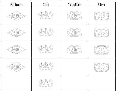 for gold: 999, 916, 750, 585, 375