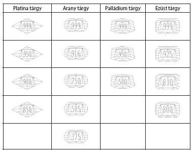 4.1. Az I. mellékletben foglalt kritériumoknak megfelelő nemesfémtárgyakon legalább az alábbi jeleket kell elhelyezni: