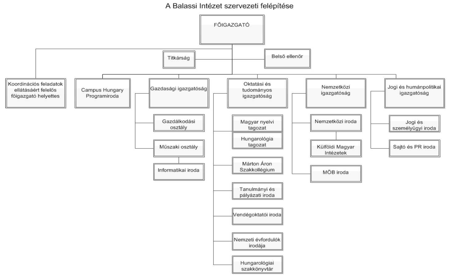 2. § (1) Az Intézet önálló szervezeti egységei: a főosztályként működő igazgatóság, a külföldi magyar intézet, a szakkollégium, a főigazgatói titkárság.