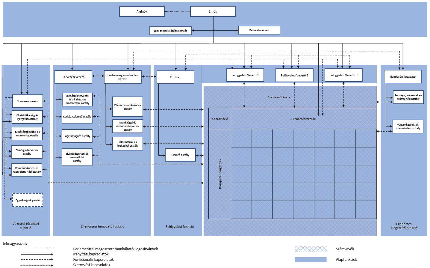 (8) Az Állami Számvevőszék szervezeti felépítését és a szervezet irányítási rendjét a 2. melléklet tartalmazza. Az Állami Számvevőszék alapfunkciója az ellenőrzés, amelyet számvevők végeznek. Az ellenőrzési feladat ellátása ellenőrzési stratégiai, ellenőrzési támogató, ellenőrzési kiegészítő, ellenőrzést vezető, ellenőrzést felügyelő, ellenőrzést irányító és ellenőrzést végrehajtó funkciók keretében valósul meg.