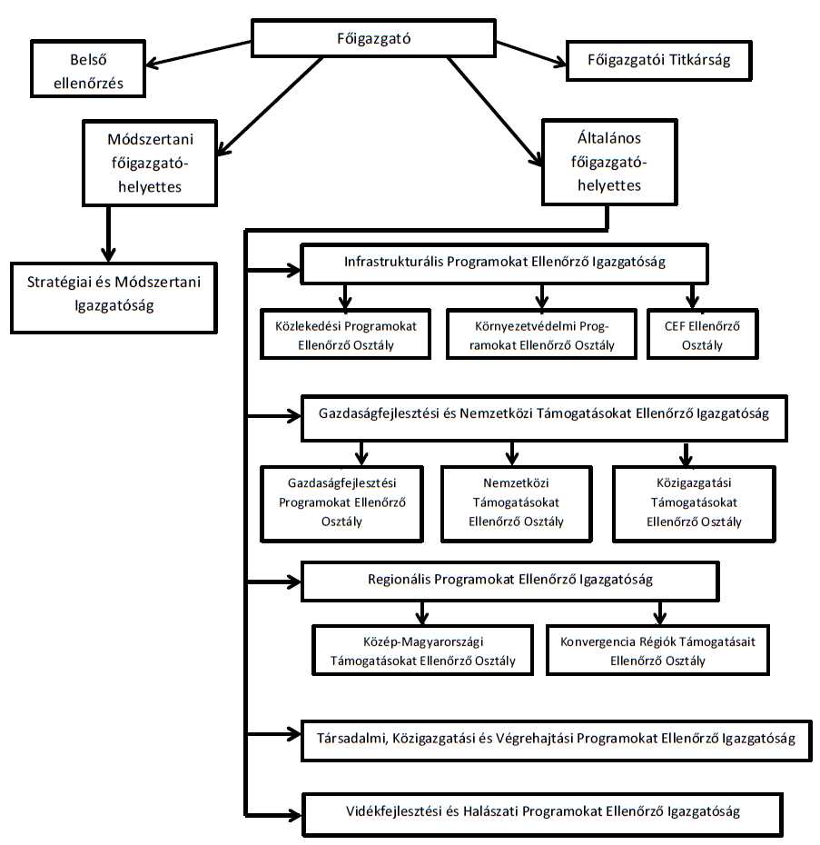 „1. A Gazdaságfejlesztési és Nemzetközi Támogatásokat Ellenőrző Igazgatóság a főigazgató irányítása alatt álló önálló szervezeti egység. Vezetője a gazdaságfejlesztési és egyéb európai támogatásokat ellenőrző igazgató. Az igazgatóság szervezeti egységei a Gazdaságfejlesztési Programokat Ellenőrző Osztály, a Nemzetközi Támogatásokat Ellenőrző Osztály és a Közigazgatási Támogatásokat Ellenőrző Osztály.”