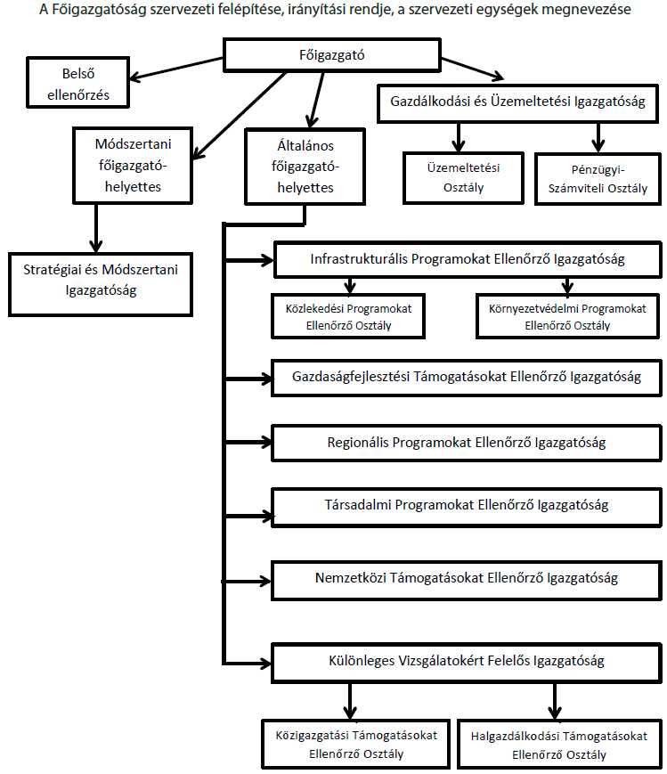 1. Az Infrastrukturális Programokat Ellenőrző Igazgatóság az általános főigazgató-helyettes irányítása alatt álló önálló szervezeti egység, amelynek vezetője az infrastrukturális programokat ellenőrző igazgató. Az Infrastrukturális Programokat Ellenőrző Igazgatóság szervezeti egységei a Környezetvédelmi Programokat Ellenőrző Osztály és a Közlekedési Programokat Ellenőrző Osztály.