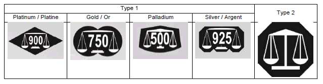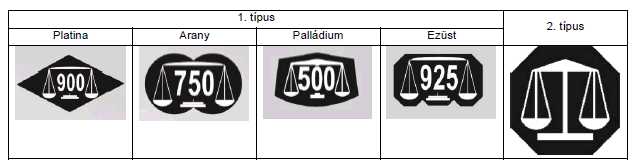 d) milyen nemesfémből készült a tárgy: ezt a nemesfém jellegét jelölő jelzés, szimbólum vagy forma mutatja.