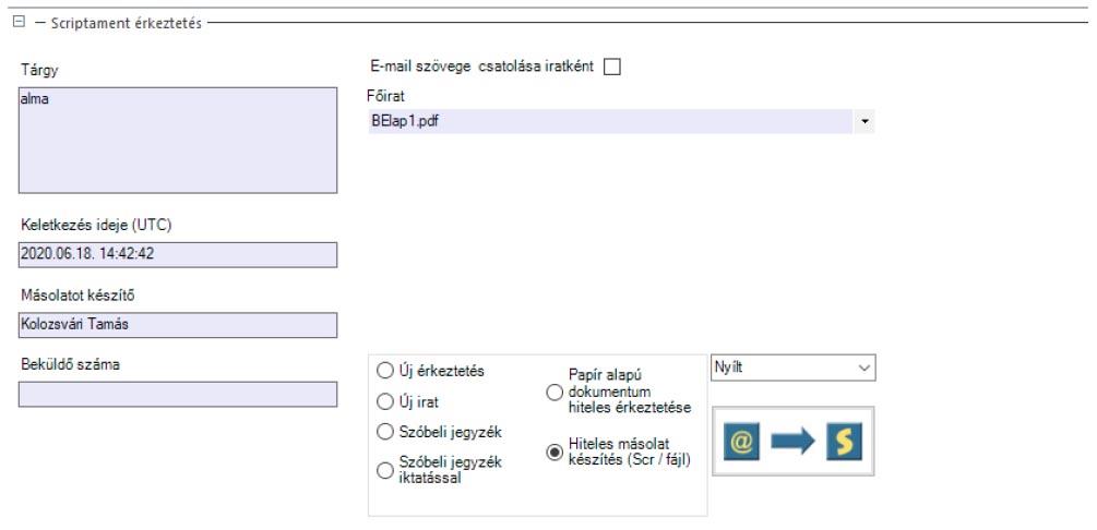 – a hitelesítést végző személy a papíralapú és a szkennelt másolat összevetése után, a kettő egyezése esetén az e-mailben érkezett iratot az Outlook_to_Scriptament funkció segítségével a „Papíralapú dokumentum hiteles érkeztetése” vagy „Hiteles másolatkészítés” opció kiválasztása után az „Érkeztetőgomb” megnyomásával beemeli az Scr.-be;