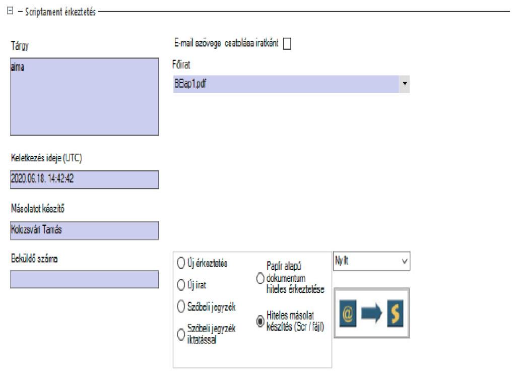 – a hitelesítést végző személy a papíralapú és a szkennelt másolat összevetése után, a kettő egyezése esetén az e-mailben érkezett iratot az Outlook_to_Scriptament funkció segítségével a „Papíralapú dokumentum hiteles érkeztetése” vagy „Hiteles másolatkészítés” opció kiválasztása után az „Érkeztetőgomb” megnyomásával beemeli az Scr-be;